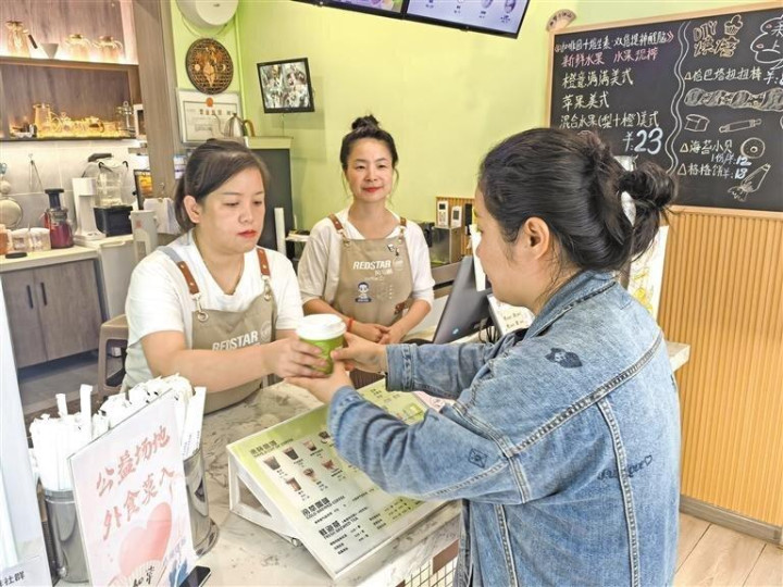 在兴乐社区“爱无碍·静默咖啡”咖啡馆,何青(左一)将做好的咖啡递给顾客(资料照片)。
